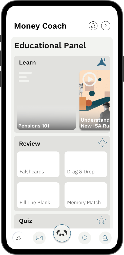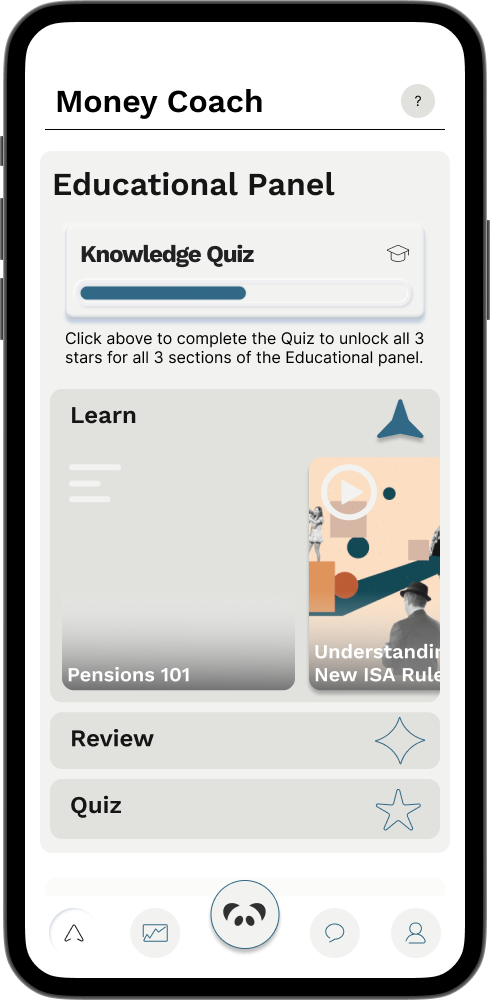 Mobile phone screen showing the Money Coach app with an Educational Panel that includes a Knowledge Quiz, a Learn section with Pensions 101 and Understanding New ISA Rules, a Review section, and a Quiz section. Navigation icons at the bottom.
