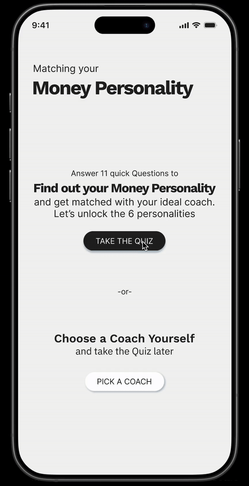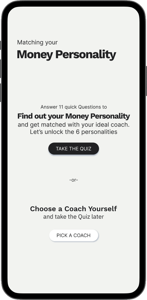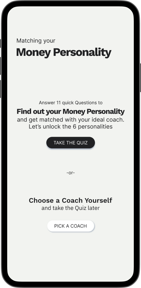 Mobile screen displaying a quiz interface titled "Matching your Money Personality" with options to take a quiz or select a coach.