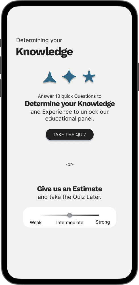 Mobile screen displaying a quiz app with a header 'Determining your Knowledge', icons for different levels of knowledge, options to take a quiz or give an estimate, and a slider for self-assessment.