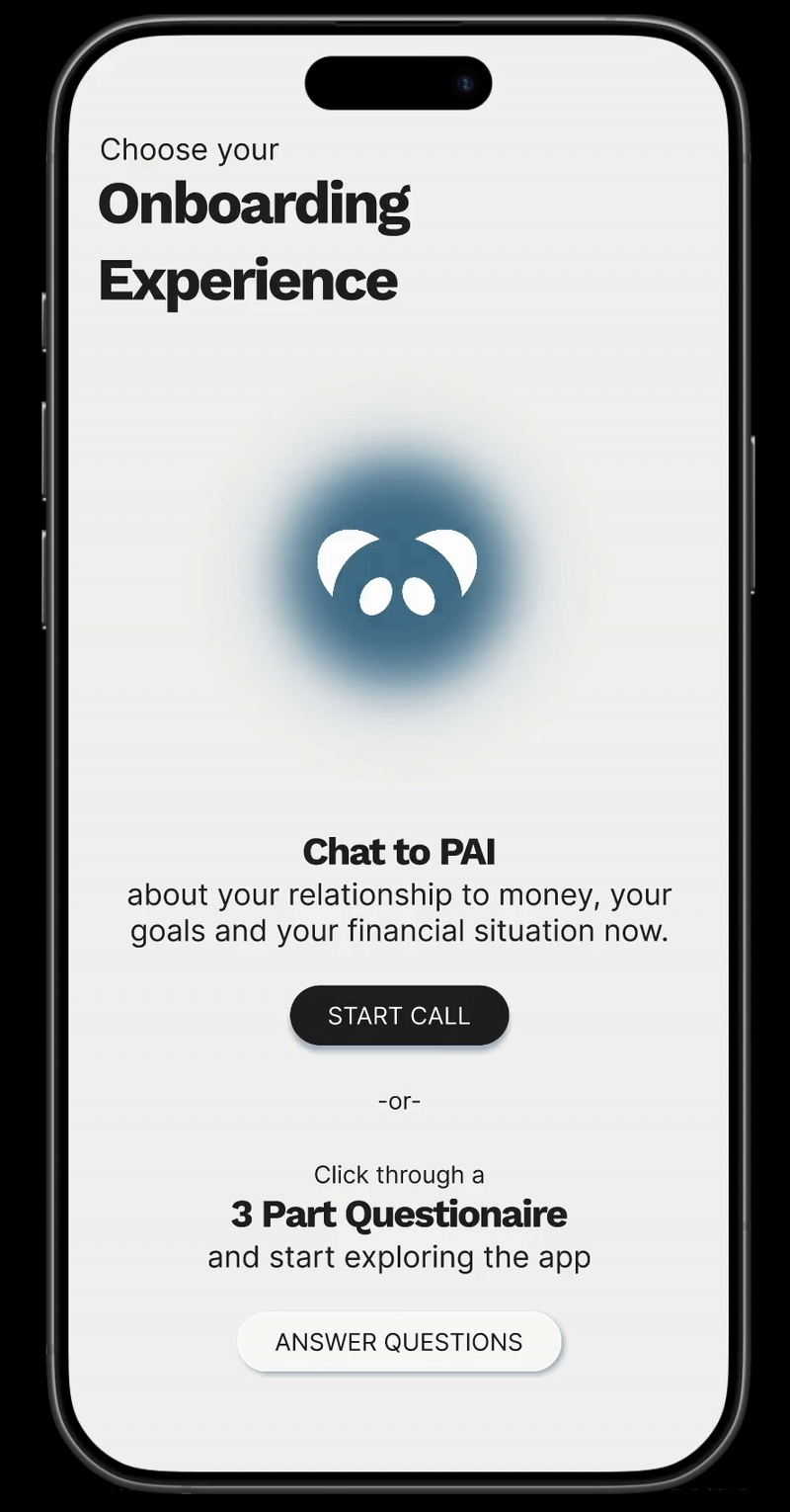 Mobile app screen for onboarding experience with options to chat with PAI about finances or complete a questionnaire, featuring a panda icon in the center.