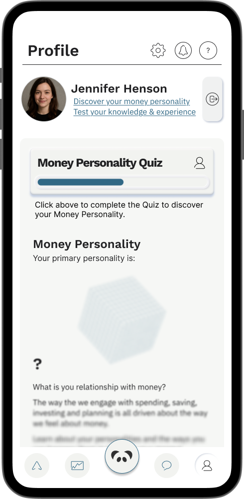 Mobile app screen showing a profile named Jennifer Henson with options to discover personality and test knowledge. Contains a Money Personality Quiz with a progress bar, a 3D hexagonal shape, and icons at the bottom and top for settings, notifications, help, sharing, and user account.